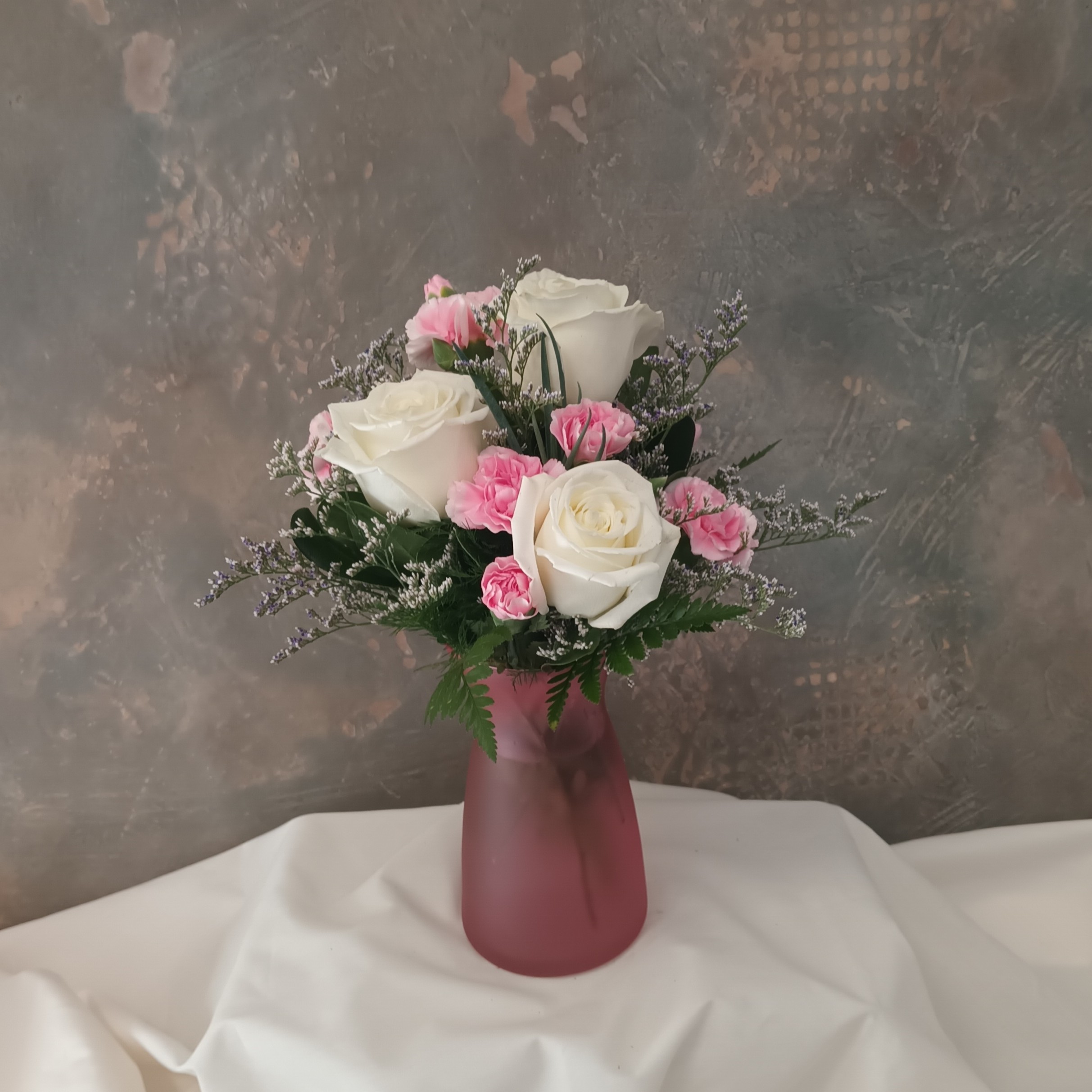 "Be Mine" BouquetCelebrate Valentine’s Day with a gift that says, “Be mine!” This adorable arrangement features three white roses and mini pink carnations with greens. Price $39.99Quantity: