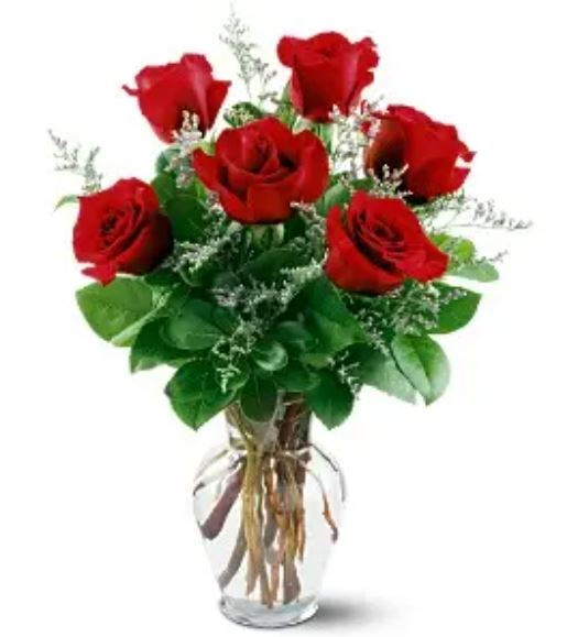 Love Is In The Air!Six red roses show them that you care with their splash of color. These come displayed in a clear glass vase, surrounded with floral greens and accent flowers. Also available in other colors.Price $69.99Quantity: