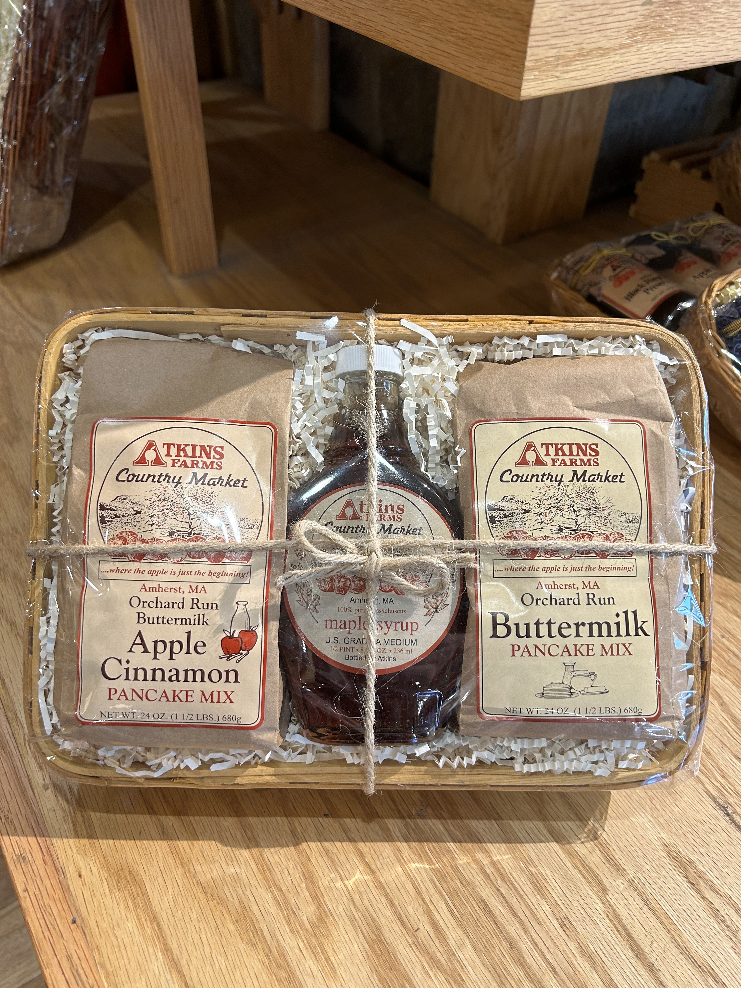 B&A Breakfast 6130Includes one 8 oz. bottle of Atkins Farms Pure Maple Syrup, Atkins Buttermilk Pancake Mix and Atkins Apple Cinnamon Pancake Mix.Price $47.99Quantity: