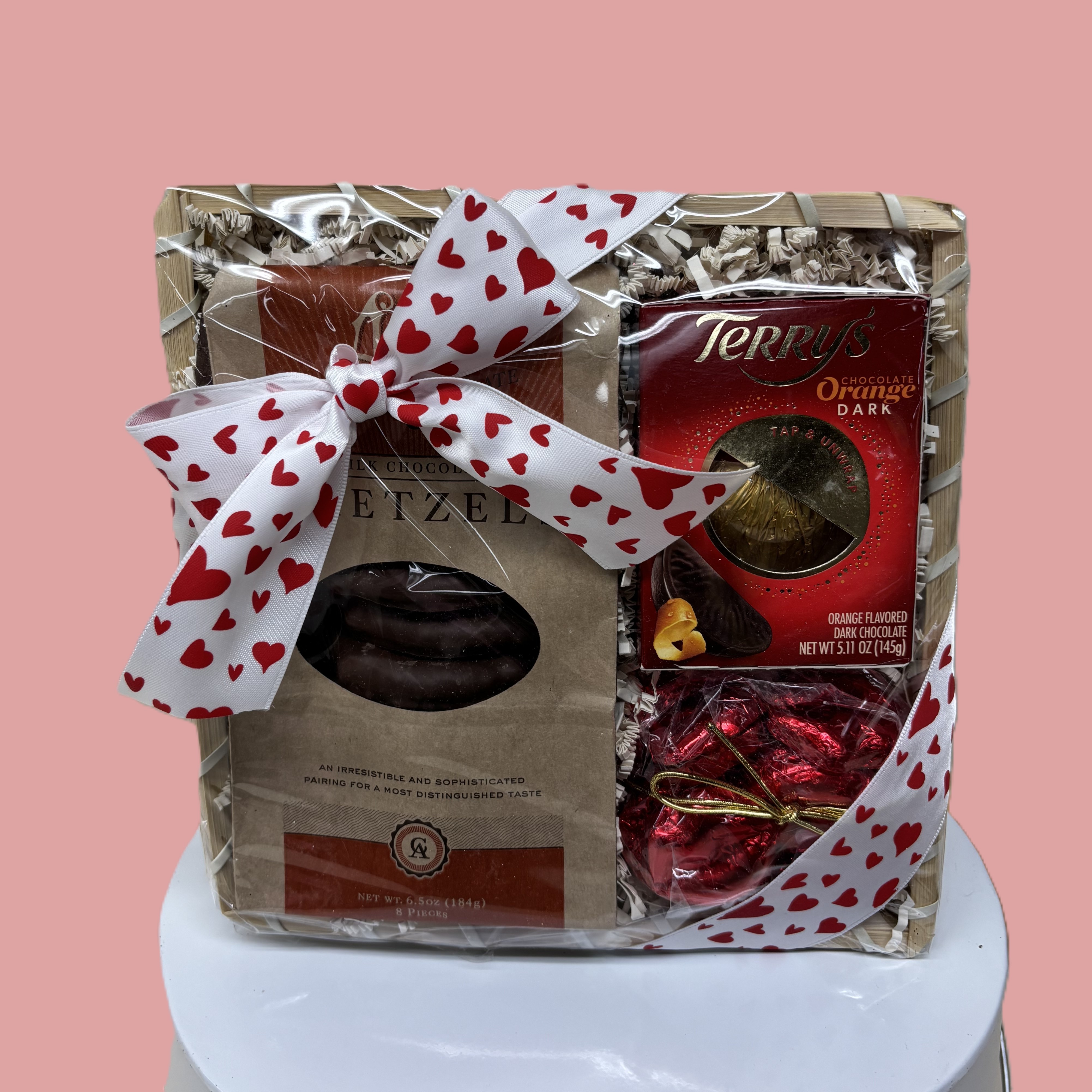 This basket is sure to give you your chocolate fix with delicious goodies such as Chocolate Dipped Pretzels, Terry's Chocolate Orange, and assorted gourmet foil wrapped chocolates.