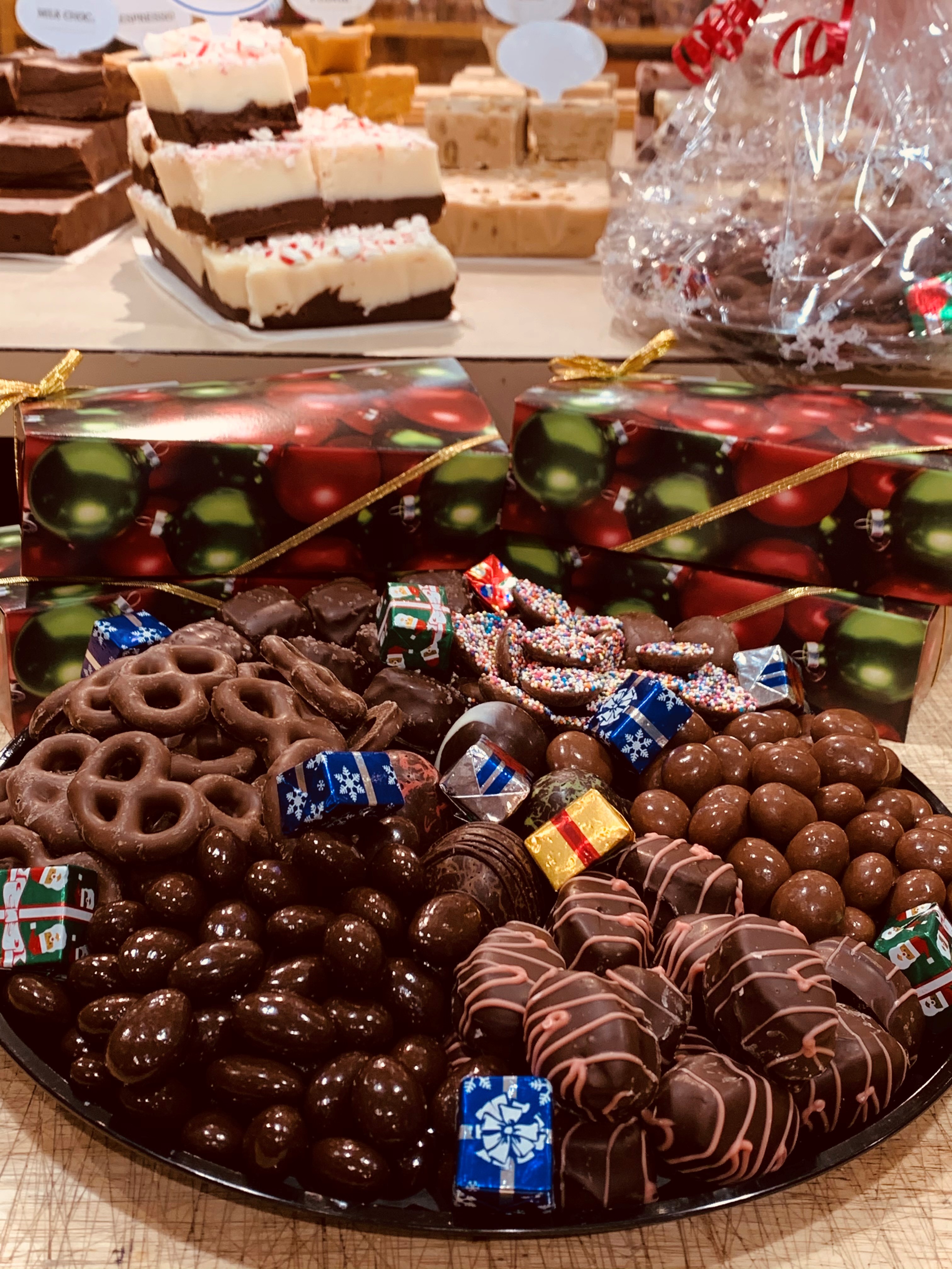 Our Deluxe Chocolate Platter contains around 3 pounds of assorted chocolates including chocolate covered pretzels or raisins, nonpariels, caramels or creams, truffles, and foil covered chocolates beautifully arranged on a platter. The platter is then wrapped with cellophane and a bow!