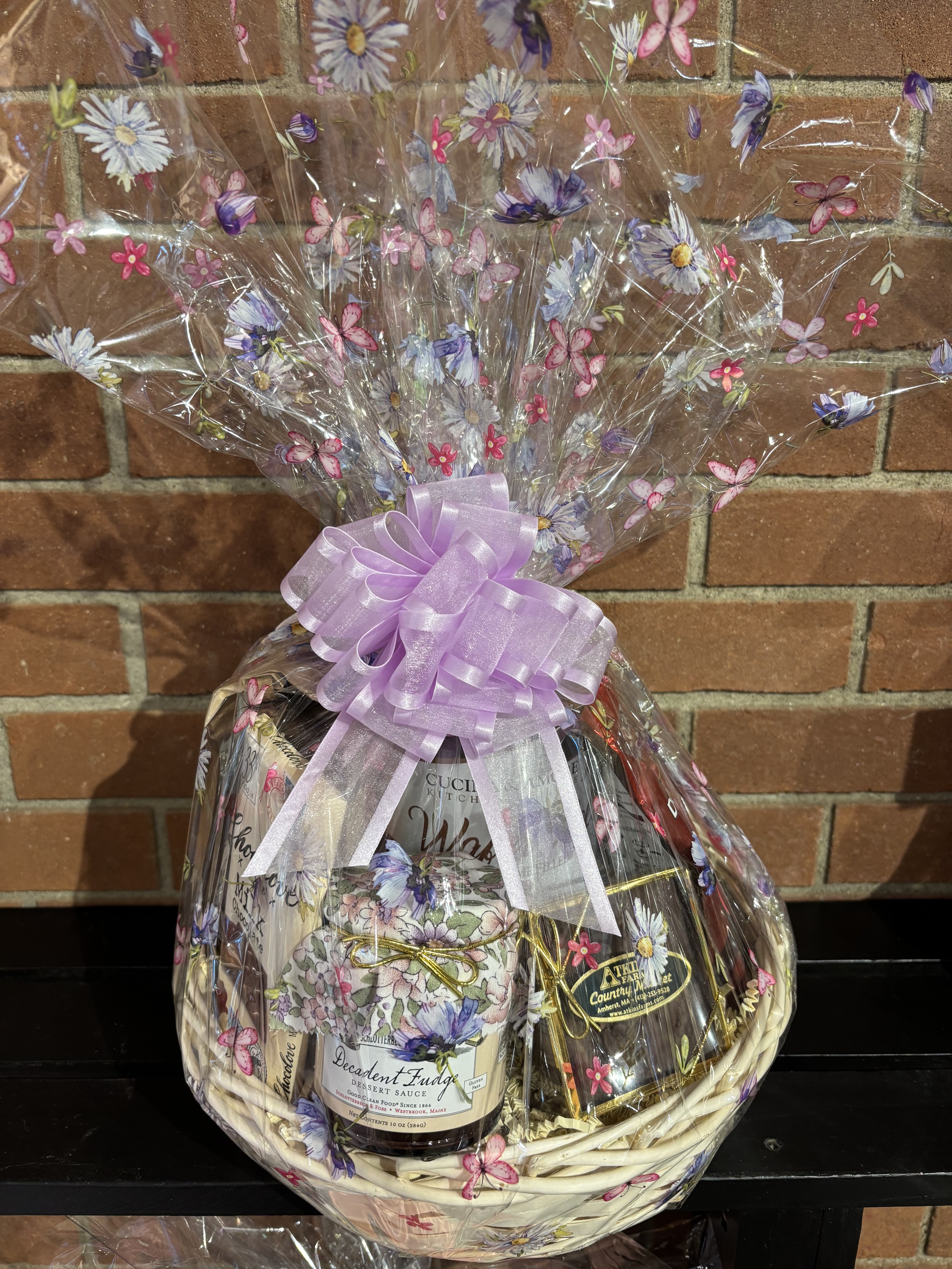 This basket is filled with irresistible chocolate treats just for Mom!!! Gourmet Chocolate Bar, Atkins Chocolate Fudge, Ghirardelli Cocoa, Hot Fudge Sauce, Chocolate Wafer Rolls, Chocolate Covered Pretzels and Chocolate Drizzled Popcorn.