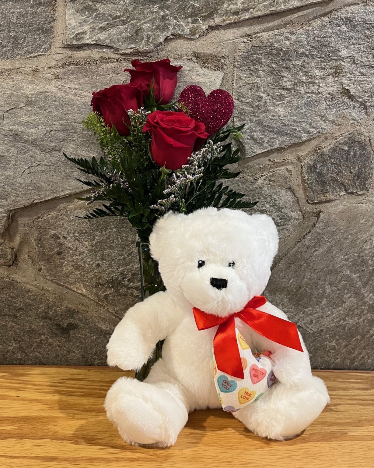 Love You Bear-y MuchThree red roses symbolizes three words, "I Love You". This triple rose bud vase is accompanied by an adorable plush teddy bear (color and style may vary)Price $41.99Quantity:
