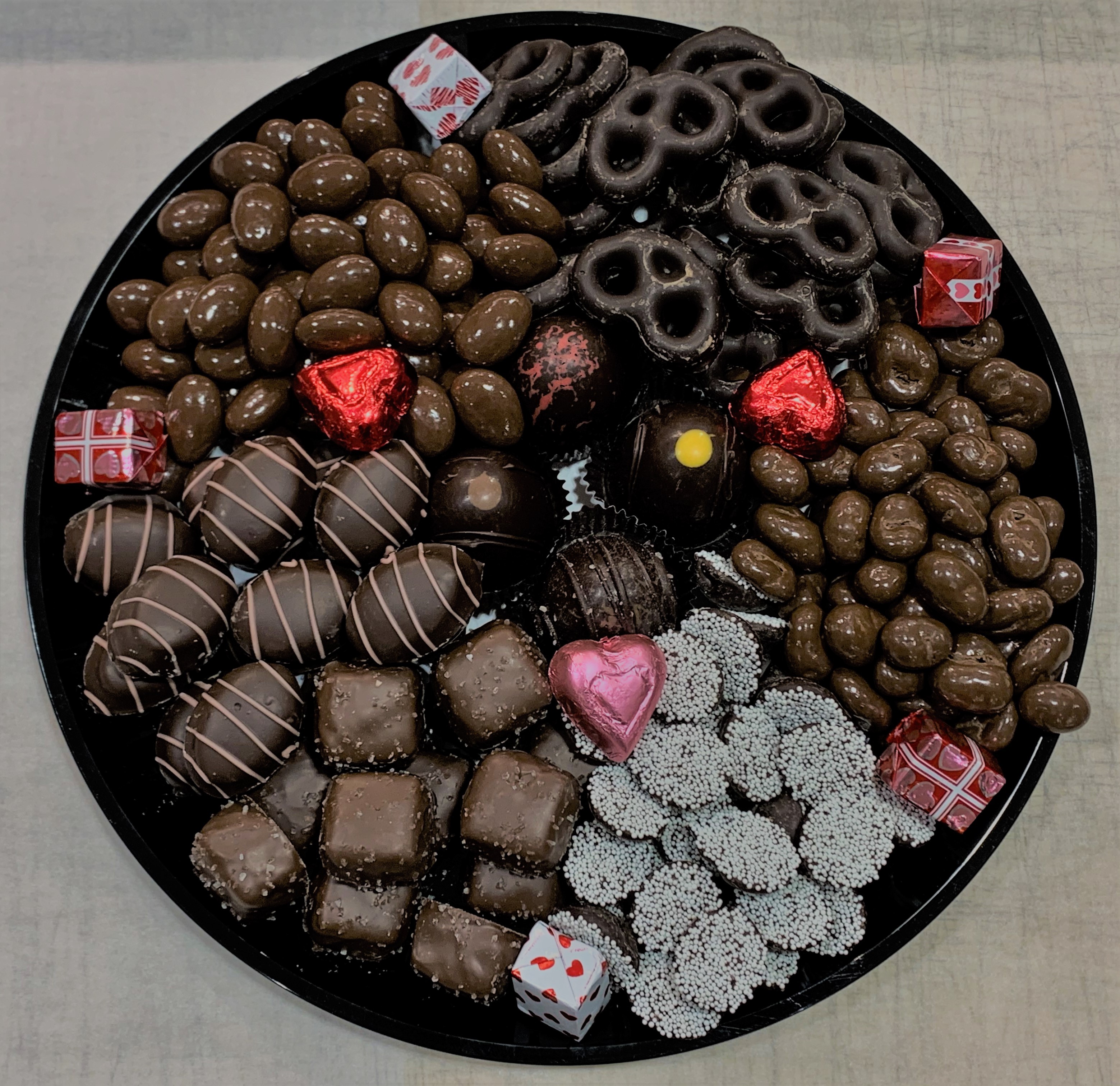 Our Deluxe Chocolate Platter contains around 3 pounds of assorted chocolates including chocolate covered pretzels or raisins, nonpariels, caramels or creams, truffles, and foil covered chocolates beautifully arranged on a platter. The Platter is then wrapped with cellophane and a bow.